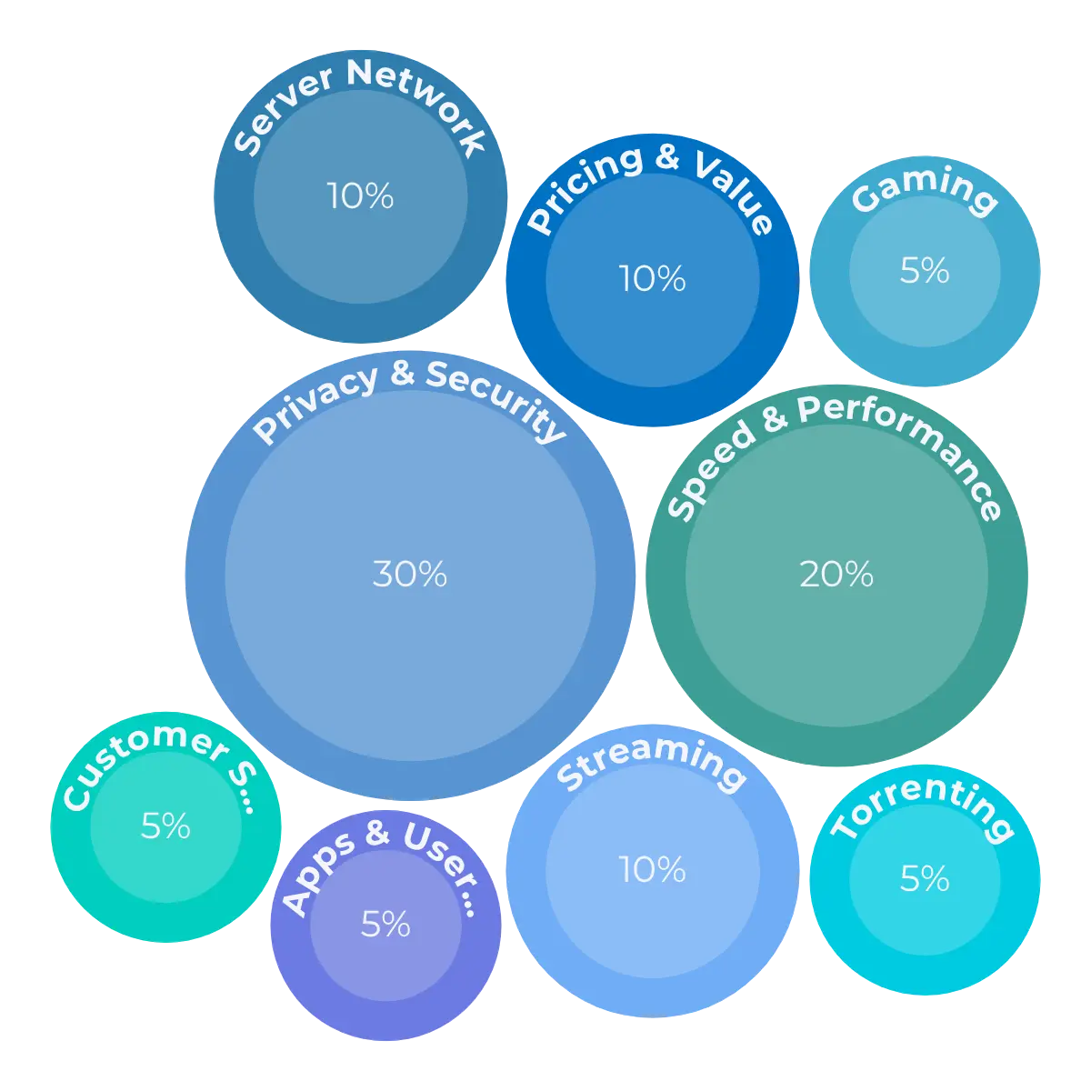 - Apps & User Experience (5%): Cross-platform compatibility, intuitive interfaces, and features like split tunneling.