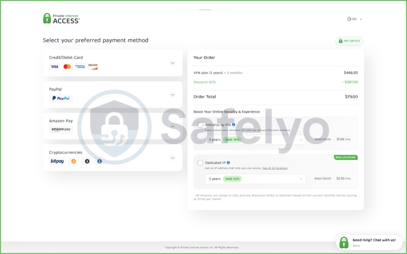 For a privacy-focused company, flexible payment methods are essential. PIA does not disappoint here.